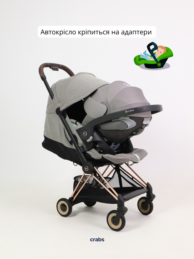 На шасі можна встановити автокрісло за допомогою адаптерів, що робить коляску ще більш універсальною.