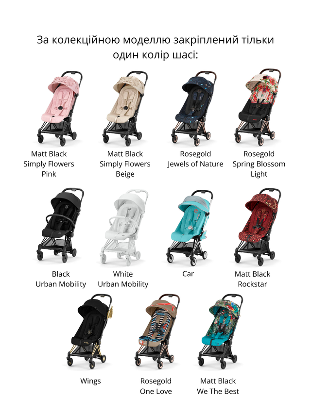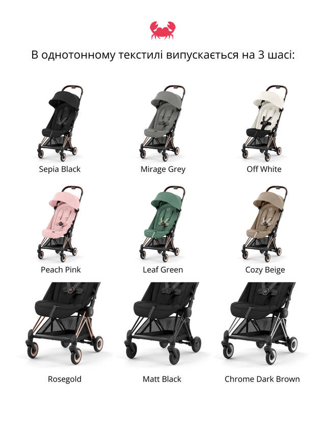 Coÿa випускається у класичних відтінках однотонного текстилю та доступна на трьох варіантах шасі: Matt Black, Chrome Dark Brown і Rosegold. Це дозволяє обрати коляску, яка гармонійно доповнить ваш стиль.
